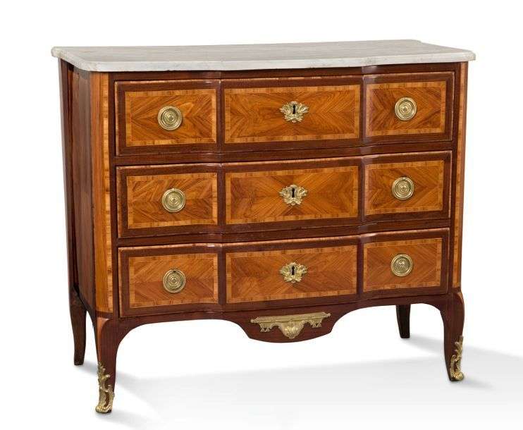 COMMODE en placage de bois de violette et satiné marqueté en feuille dans des réserves ornées de filets de bois clair. Elle ouvre en façade par trois tiroirs sur trois rangs. Les montants arrondis reposent sur des pieds cambrés ornés de bronzes ciselés et dorés. Plateau de marbre mouluré blanc (postérieur). (Restaurations d'usage).