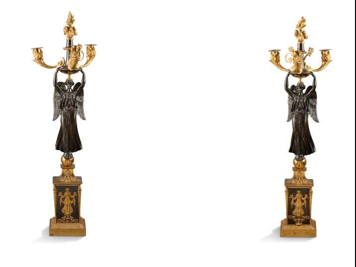 PAIRE DE GRANDS CANDÉLABRES en bronze ciselé, patiné et doré figurant une Victoire ailée soutenant un bouquet à trois brandons de lumières sommé d'une urne flammée. Ils reposent sur un socle orné, aux angles de quatre brandons de lumière, d'une femme à l'antique tenant dans ses mains un oiseau et un papillon et en partie inférieure d'une frise de pampres.