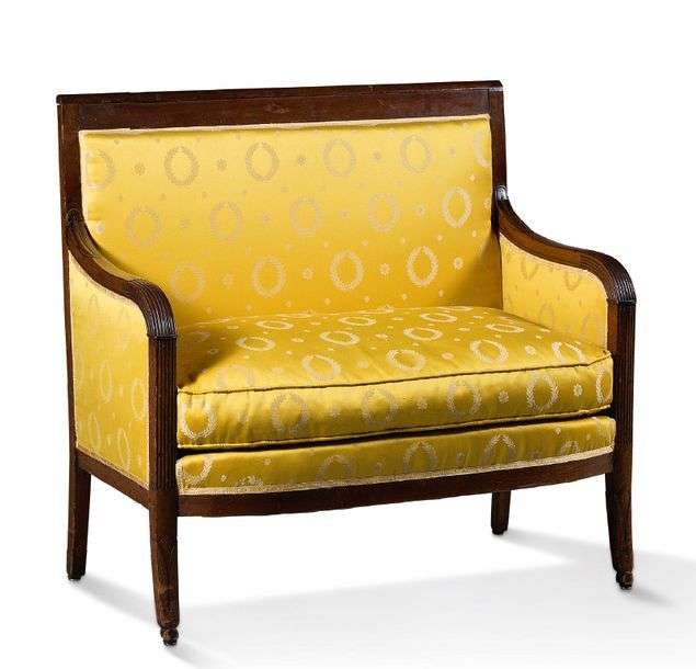 Les accotoirs et montants à motif de fleurs de roseaux et cannelures. Elle repose sur deux pieds antérieurs terminés par des pastilles et deux pieds postérieurs sabre.