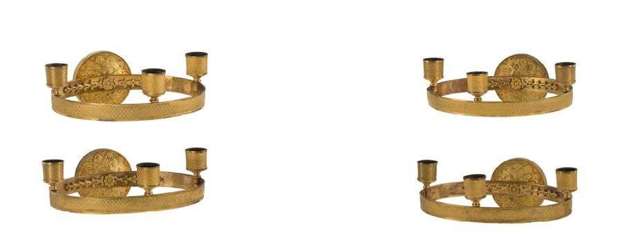 SUITE DE QUATRE APPLIQUES en bronze doré à cerceaux ovales quadrillés surm