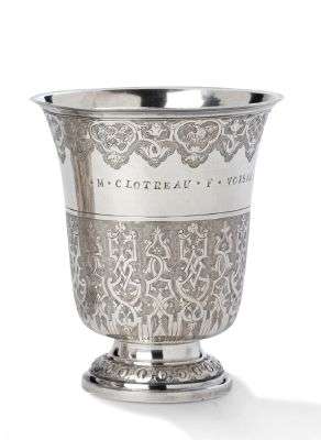 ELÉGANTE TIMBALE DE FORME TULIPE en argent à filets à deux registres. Riche décor ciselé d'entrelacs, lambrequins et volatiles sur fond amati reposant sur un piédouche à décor d'une frise de feuilles d'eau Gravé * M* CLOTREAU*F*VOISIN*
