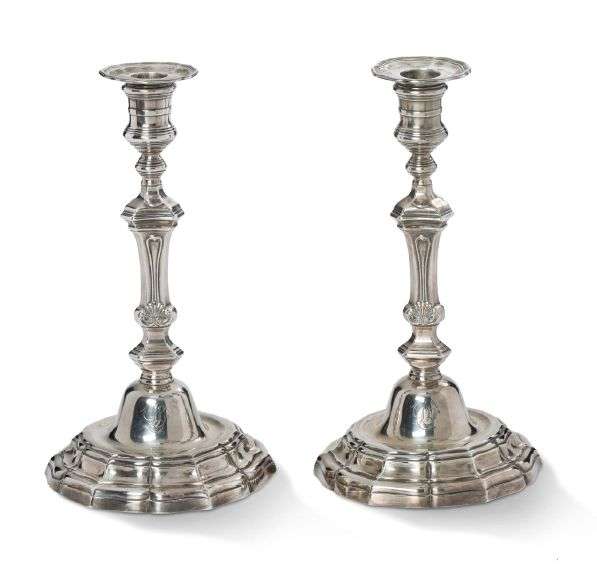 PAIRE DE GRANDS FLAMBEAUX en argent chiffré, le fût à trois faces est orné de coquilles et nervures, il repose sur une base chantournée à filets.