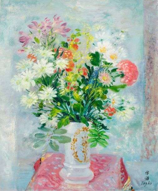 Ce n’est qu’à partir des années 1960 que Le Pho débute sa production de natures mortes florales d’inspiration impressionniste à l’huile, alors qu’il inaugure son partenariat avec la galerie Findlay. Ayant pour objectif de plaire à un plus large public, notamment américain, l’artiste démontre au travers de ces œuvres, son exceptionnelle capacité à laisser transparaître les couleurs de manière fluide et délicate. Reconnaissables par leurs caractéristiques techniques, ces œuvres témoignent de l’intégration de l’art occidental et de l’héritage traditionnel vietnamien.