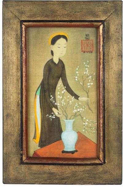 Mai Trung Thu, dit Mai Thu, est un peintre vietnamien né en 1906. Issu d’une grande famille, son père, Mai Trung Cat était gouverneur de Bac Ninh et s’est vu accorder le titre de baron par le gouvernement français. En 1925, Mai Thu intègre la première promotion de l’Ecole des Beaux-Arts d’Indochine, dirigée par Victor Tardieu. C’est au cours de ses années d’études qu’il s’intéresse à la peinture illustrant des scènes de la vie rurale vietnamienne. Il choisira de les peindre sur de la soie, un matériau coûteux et aussi délicat que la palette de couleurs qu’il emploie.