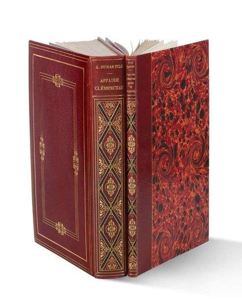 Reliure de l’époque signée de Crettté, successeur de Marius Michel. Plein maroquin rouge à grain long. Plats ornés d’un quadruple encadrement de filets dorés avec fleurons, dos lisse orné et mosaïqué de maroquin vert. Contreplats bordés de maroquin rouge orné de filets dorés, doublures et gardes de moire vert d’eau, tranches dorées, étui (mors supérieur fendu sur 12 cm). Dimensions : 275 x 180 mm.