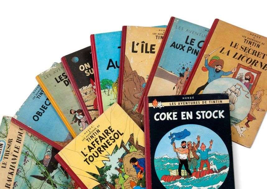 - Les 7 boules de cristal, Casterman, 1948. Dos jaune, 4e plat B2. EO. - Le Crabe aux pinces d'or, Casterman, 1948. Dos rouge, 4e plat B2. - Le Trésor de Rackham le Rouge, Casterman, 1947. Dos jaune, 4e plat B1. - Tintin au Congo, Casterman, 1947. Dos rouge, 4e plat B1.- Le secret de la licorne, Casterman, 1948. Dos rouge, 4e plat B2.- L'île noire, Casterman, 1947. Dos rouge, 4e plat B1. - L'affaire Tournesol, Casterman, 1956. Dos rouge, 4e plat B20. EO française, n°505, imprimerie Danel. - Coke en stock, Casterman, 1958. Dos rouge, 4e plat B24, page de garde bleu clair. EO française, N°575, imprimerie Danel. - Objectif lune, Casterman, 1953. Dos rouge, 4e plat B10, page de garde bleu foncé. - On a marché sur la lune, Casterman, 1954. Dos rouge, 4e plat B11, page de garde bleu foncé. EO française, n°368, imprimerie Danel.