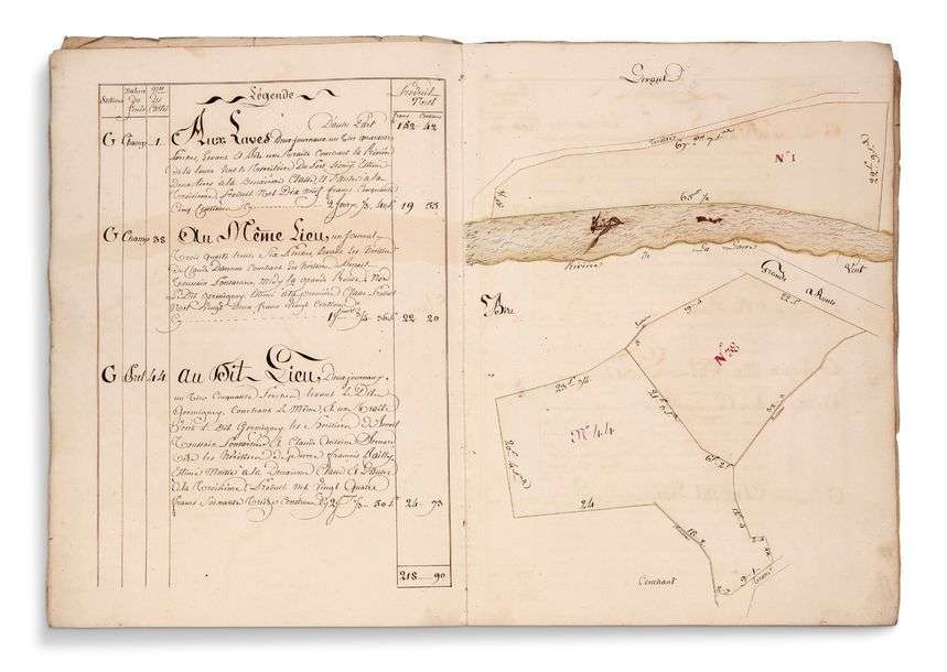 France, Montpatey, 1866-1878 7 grands plans (planches doubles) rehaussés + extrait de la matrice cadastrale de Coûches-les-Mines. Demi-reliure de cuir à coins, plats couverts de papier chagriné noir (reliure accidentée, plats détachés). Dimensions: 670 x 525 mm.
