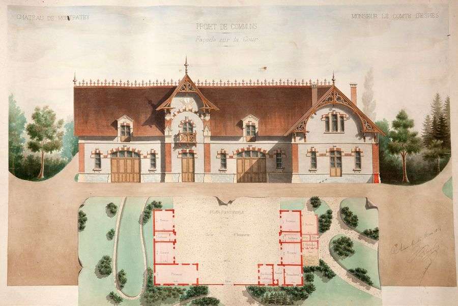 Façade principale et Façade du côté de l'arrivée 2 plans aquarellés sur papier datés février 1862 signés de l'architecte Arthur Prochiche. 62,5 x 96 cm.