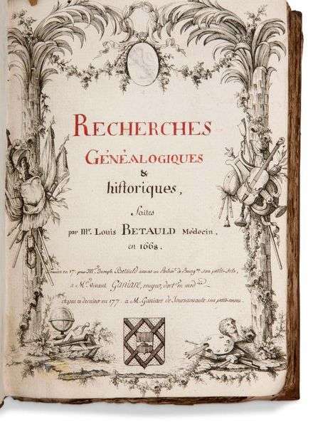 Recherches généalogiques & historiques faites par Mr. Louis Betauld médecin en 1668, données en 17.. par M. Joseph Betauld avocat au Parlement de Bourgogne son petit-fils a M. Vivant Ganiare, ecuyer, docteur en médecine et par ce dernier en 177.. a M. Ganiare de Joursanvault son petit-neveu.