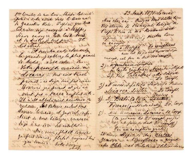 L.A.S. «M.B.» Locarno, 23 août 1871. 4 pp. bi-feuillet in-8| en français.