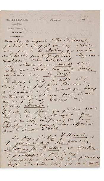 Mon cher, en voyant votre écriture, j'ai d'abord supposé que vous m'écriviez pour le De Molènes, qui venait de partir pour l'imprimerie, sous une enveloppe à votre adresse. Mais c'était pour m'avertir d'un billet qui échoit dans 29 jours et l'autre dans 50 jours. 1er depuis 4 mois, je passe chez Texier deux fois par semaine| je le tourmente en lui disant que vous me tourmentez. A chaque fois, il me dit que je vais recevoir mes épreuves demain [L'article sera finalement publié dans le Figaro en 1863]. 2ème M. De Saux que j'ai vu avant-hier m'a dit (...) que le ministre avait renvoyé mon affaire (...). De plus, j'ai FINI le Villemain, les poëmes en proses, les peintres didactiques, les Dandies et Eureka [traduction d'Edgar Allan Poe]. Je puis disposer du prix de ces manuscrits en faveur de qui je voudrai. Reste à savoir chez qui et à quelle date paraîtront ces morceaux qui ne sont pas tous placés. Baudelaire ajoute en gros caractères: Jamais je n'oublie rien (...).