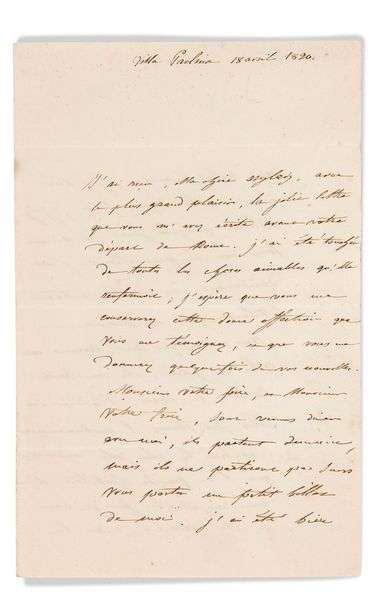 Lettre délicate dans laquelle Pauline décrit avec enthousiasme la Villa Paolina où elle séjourne, «toute couleur de roses», embaumant les lilas... La princesse a reçu la jolie lettre que sa correspondante a écrit avant son départ de Rome. (...) Je suis à ma villa depuis hier, j'y resterai quelques jours, et si mes forces me le permettent, j'irai décidément à Palo entre Civita-Vecchia et Rome. Vous n'avez pas idée, comme ma villa est jolie, elle est toute couleur de roses, l'odeur des lilas, des fleurs, l'embaument. C'est bien le plus bel endroit que l'on puisse habiter. Elle me rappelle le jour où vous y êtes venue (...).