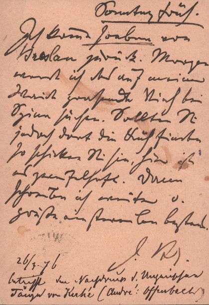 C.A.S. «J. Br.» à Fritz Simrock. S.l., (Dimanche tôt le matin), 26 mars 1876. 1 p. in-12 sur carte de correspondance, adresse, timbre et marques postales, petites taches| en allemand.