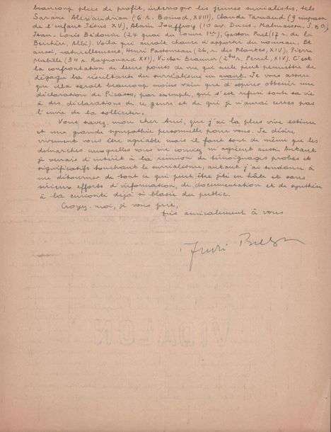 Breton se montre rétif à un projet de publication de témoignages sur le Surréalisme. Intéressante lettre dans laquelle Breton évoque les tensions au sein des surréalistes et se montrant critique vis-à-vis de l'engagement de Picasso. (...) En ce qui concerne le projet de la Gazette des Lettres, je m'y vois très mal tenir le rôle que vous m'assignez. Un quart de siècle... sans doute mais c'est bien là la dernière commémoration à laquelle je puisse prendre part. Je n'éprouve aucun désir de me mesurer à cette occasion avec les «ex-surréalistes du C.N.E.» que vous croyez devoir consulter et dont je récuse par avance le témoignage. Ces messieurs m'offrent-ils jamais la discussion? (...). Il lui conseille plutôt d'interroger les jeunes surréaliste tels Sarane Alexandrian, Claude Tarnaud, Alain Jouffroy, Jean-Louis Bédouin, Gaston Puel. Voilà qui pourrait apporter du nouveau (...). Je vous assure que cela serait beaucoup moins vain que d'espérer obtenir une déclaration de Picasso, par exemple, qui s'est refusé tout sa vie à des déclarations de ce genre et de qui je n'aurais certes pas envie de solliciter (...).