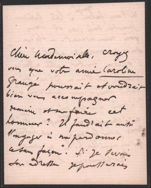 Degas présente ses excuses à une danseuse d'opéra. (...) Croyez vous que votre amie Caroline Grangé pourrait et voudrait bien vous accompagner demain et me faire cet honneur? il faudrait aussi l'engager à me pardonner ce sans façon. Si je savais son adresse je pousserais ce sans façon jusqu'à lui écrire (...) Hier soir, je voulais aller à l'opéra tenter cette affaire grave et l'on a dîné si tard dans une maison où j'étais que je n'ai pu m'échapper à temps. Faites donc pour le mieux, et surtout qu'on veuille bien m'excuser. Je plongeais l'autre soir de trop haut et trop à pic pour avoir bien vu votre Espagnolerie. Je la verrai mieux lundi à l'orchestre (...).