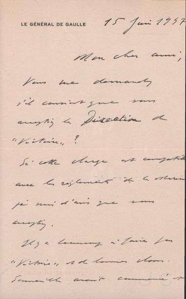 L.A.S. au vice-amiral Paul Ortoli. 15 juin 1947. 1 p. ½ bi-feuillet in-8, en-tête du général.