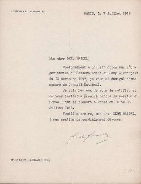 Le général confie au futur sénateur des fonctions politiques au sein de son parti le R.P.F. Conformément à l'Instruction sur l'organisation du Rassemblement du Peuple français du 13 novembre 1947, je vous ai désigné comme membre du Conseil National (...). Il l'invite à participer à la session du Conseil qui se tiendra à Paris du 19 au 25 juillet.
