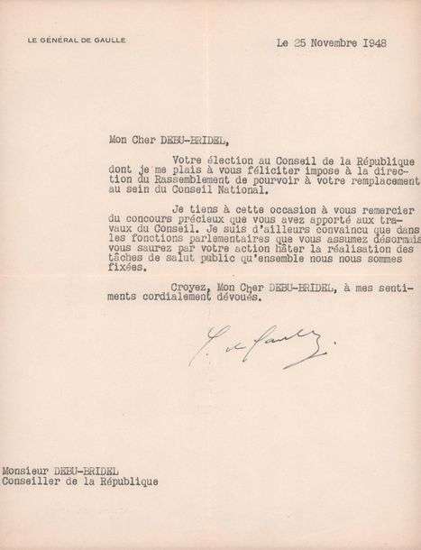 L.T.S. à Jacques Debu-Bridel. S.l., 25 novembre 1948. 1 p. in-4, en-tête en coin du général De Gaulle.