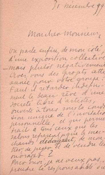 A propos du «doux rêve» du peintre de créer une Société d'Artistes où tous pourraient librement exposer. (...) On parle enfin, de mon côté, d'une exposition collective, mais plutôt négativement. Avez-vous des projets cette année pour votre groupe? Faut-il retarder indéfiniment le beau rêve d'une Société libre d'artistes, ouverte à tous sous la condition unique de l'invitation personnelle, et qui permettrait à tous ceux que les salons refusent, ou que les marchands dédaignent, de montrer, de juger et de vendre leurs ouvrages? Pour moi, je ne veux pas prendre la responsabilité d'un lâchage, et avant de renoncer à une combinaison comme celle de l'an passé, je vous remande où vous en êtes, et ce que vous pensez. Si Paul Signac est à Paris, demandez lui conseil de ma part (...).