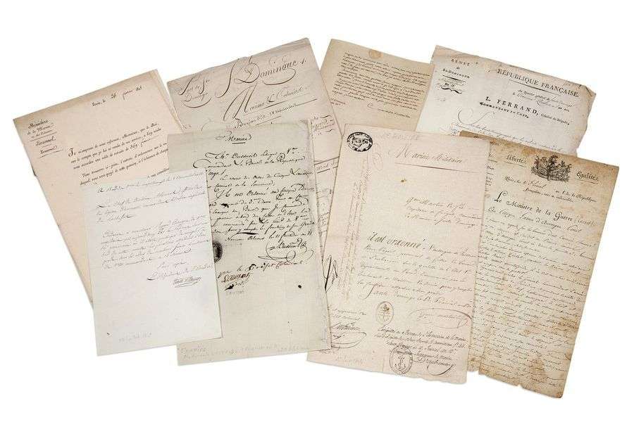[EMPIRE]. 16 Documents (Carnot), Rousselin de St-Albin 5, La Tour d'Auvergne, Dussueil, Willaumez, Cte Molé, certificats de marine militaire (4), vue aquarellée de la tombe de Napoléon à Ste Hélène