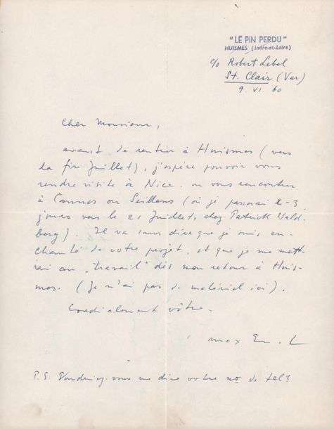 A propos d'un projet qui l'enchante. Avant de rentrer à Huismes à la fin du mois, il espère pouvoir rendre visite à son collaborateur à Nice| il propose aussi de le rencontrer à Cannes ou Seillans où il doit passer quelques jours chez le poète et critique d'art Patrick Waldberg. (...) Il va sans dire que je suis enchanté de votre projet et que je me mettrai au travail dès mon retour à Huisme (je n'ai pas de matériel ici) (...).