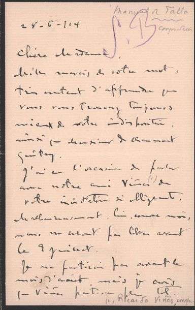 Déclinant lui, et son ami pianiste espagnol Ricardo Vinès, une invitation. De Falla remercie sa correspondance pour sa lettre. J'ai eu l'occasion de parler avec notre ami Vinès de votre invitation si obligeante. Malheureusement, lui comme moi, nous ne serons pas libres avant le 9 juillets (...).