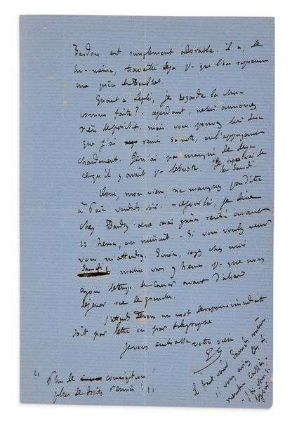 A propos de son intervention auprès du ministre de l'Instruction publique, en faveur de Laporte pour lequel il a demandé un rendez-vous. Mon vieux Bob. Vous êtes invité à venir Samedi prochain déjeuner chez le Ministre de l'instruction publique à 11h ½. Voilà le résumé de la conversation que je viens d'avoir avec lui, à trois reprises différentes. Le dialogue a été long et sérieux. D'Osmoy qui m'a l'air du vice-ministre, je parle très sérieusement, veut vous nommer directeur des Gobelins (sic) à la place de Darcel qu'on se propose de foutre à la porte. (C'est un secret d'Etat). J'ai dit que vous n'en demandiez pas tant. Mais une place médiocre est plus difficile à avoir qu'une très belle (...) il y aura une place pour vous. Je n'en doute pas. Bardou [le ministre] est simplement adorable. Il a, de lui-même travaillé déjà pour que l'on reprenne une pièce de Bouilhet. Quant à Leplé, je regarde la chose comme faite. Cependant ne lui annoncez rien de positif (...). Flaubert demande de ne pas manquer le rendez-vous| il dînera ce soir là chez Baudry. Si vous voulez venir, vous m'attendrez. Sinon soyez chez moi (...) pour que nous ayons le temps de causer avant d'aller déjeuner rue de Grenelle (...). Flaubert insiste sur le rendez-vous et ajoute en p.s.: il faut venir samedi même si vous aviez les 4 membres cassés. «Plus de conscription! Plus de droits réunis!».