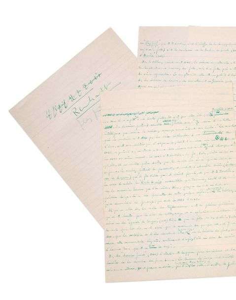 Manuscrit aut. signé «Rembrandt». S.l.n.d. (circa 1958). 24 pp. grand in-4, encre verte et stylo à bille, nombreuses corrections| signature au feuillet de titre qui comporte un titre biffé Le Palais de la chaumière| joint un tapuscrit de 9 pp.