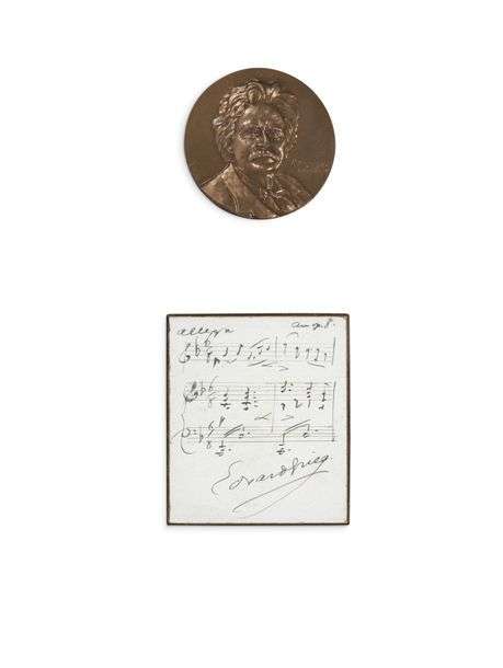 Envoi musical signé. S.l.nd. 1 p. in-16, sous encadrement avec médaille en bronze à l'effigie du compositeur.