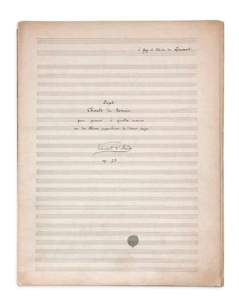 Manuscrit complet des Sept Chants de terroir pour piano à quatre mains. Composés au château des Faugs et à Paris à la fin de l'été et au début de l'automne 1918, les Sept Chants furent publiés à Paris la même année, chez Rouart, Lerolle et Cie. Ils sont dédiés à un ancien élève, devenu professeur de contrepoint à la Schola Cantorum, Guy de Lioncourt, et à la nièce du compositeur, Claire de Pampelonne, l'épouse de Lioncourt. Écrits «sur des thèmes populaires de divers pays», les Sept Chants de terroir comprennent: I Novelle novellet. À Cassis en Provence, en fa dièse, à 3/4, marqué «Animé, et simplement», chant de «Petites filles provençales» II Rigaudon. Sur la place de Lachamp-Raphaël. (Hauts plateaux vivarois), en do dièse, à 6/8, marqué «Un peu animé et lourdement», chant de «Danseurs cévenols» III Seguidilla. À l'alameda de Séville, en do, à 3/8, marqué «Assez vite», chant de «Guitarreros» IV Yonkina. Sur le port de Yokohama. (Japon), en do, à 4/4, marqué «Très modéré, indolent», chant de «Matelots japonais» V Chanson de plein vent. Au bord de la rivière. (Forêt de Pavlosk), en mi bémol, à 7/4, marqué «Très largement», chant de «Chanteur russe. (Accompagnateur polonais.)» VI Aubade. Devant la Madone des tre capannelle. (Campagne romaine), en sol dièse, à 6/8, marqué «Modéré», chant de «Zampognari» VII Tarentelle. Sur le bateau de Capri. (Golfe de Naples), en do, à 6/8, marqué «Vite», chant de «Pitres napolitains».