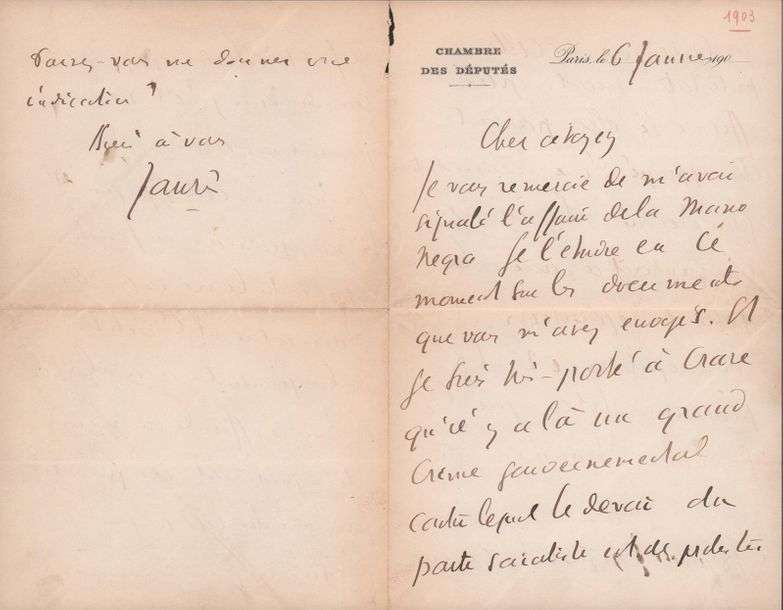 A propos du groupe anarchiste la Mano Negra, actif en Andalousie| le gouvernement espagnol venait de mener une sévère répression contre ce mouvement, affaire qui fut relayée par les socialistes en France par plusieurs articles et meetings. (...) Je vous remercie de m'avoir signalé l'affaire de la Mano Negra, je l'étudie en ce moment sur les documents que vous m'avez envoyés. Je suis très porté à croire qu'il y a là un grand crime gouvernemental contre lequel le devoir du parti socialiste est de protester (...). Jaurès demande une documentation plus étendue, texte des réquisitions, les interrogatoires et les plaidoiries, pour pouvoir prendre leur défense. Est-ce que les journaux espagnols ne rendent pas compte des procès criminels comme le font si complaisamment ceux de France? et ne pourrait-on pas avoir les journaux de cette époque? Si nous pouvions faire apparaitre le message de l'accusation et l'audition de la poursuite avec les documents officiels au moins cela apporterait une grande force à notre campagne (...).