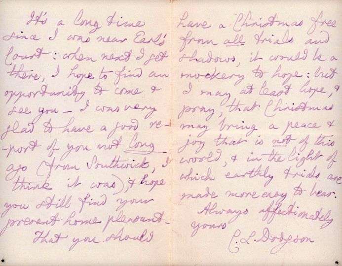 Lettre familiale à la soeur cadette de Carroll qui s'enquiert de ses nouvelles et lui promet de venir passer la voir la prochaine fois qu'il passe près de chez elle. Un de ses grands amis, Mr Shute, bon artiste qui a étudié à l'Ecole d'Art de Slade, a fait un livre intelligent dont il lui enverra une copie. Il espère qu'elle ne le trouvera pas trop lourd à lire. Il y a longtemps qu'il n'est pas passé près de Earl's Court et espère avoir l'opportunité de venir la voir| It's a long time since I was near Earl's Court| when next I get there, I hope to fine one opportunity to come and see you. I was very glad to have a good report of you not long ago (from Southwick, I think itw as), & hope you & will find your present home pleasant. Il lui adresse de façon émouvante tous ses voeux d'espoir pour Noël loin de toutes inquiétudes| That you should have a Christmas free from all trials and shadow, it could be a mockery to hope| but I may at least hope, I pray that Christmas may bring a peace & joy that is not of this world & in the light of which earthly trials are made more easy to hear (...).