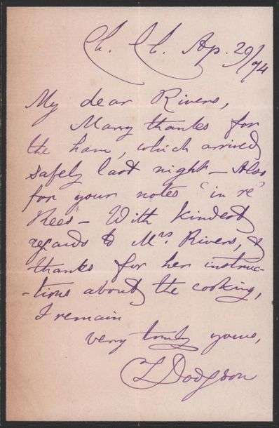 L.A.S. «C.L. Dogson» à son cher Rivers. Ch. Ch. [Oxford, Christ Church] 29 avril 1894. 1 p. in-12| en anglais.
