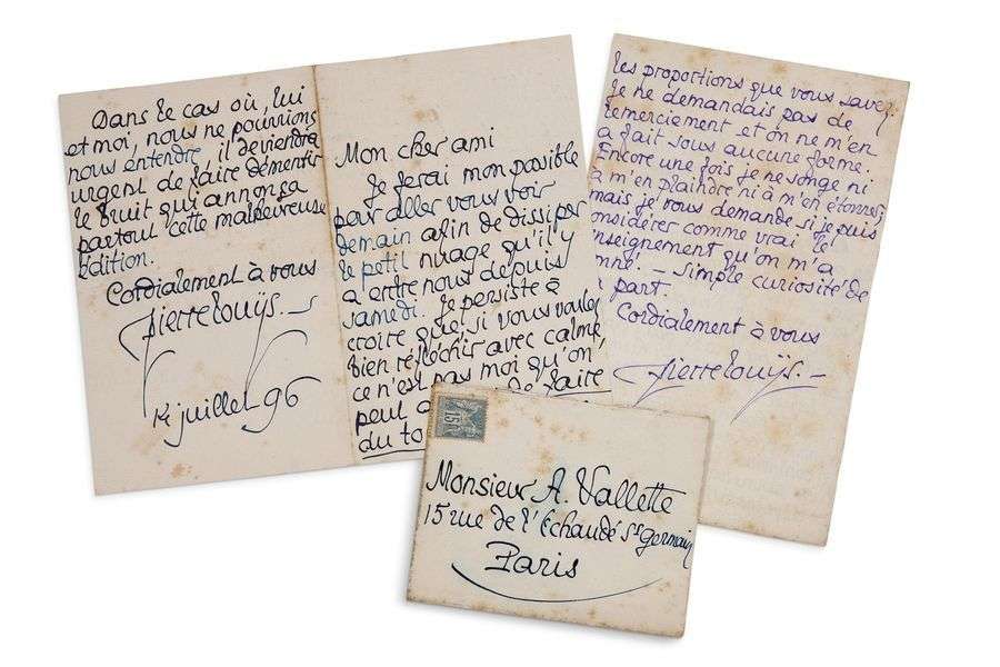 Se justifiant de vouloir faire du tort au Mercure de France| il n'a en effet pas suivi l'exemple de tous les littérateurs actuels (Zola, Theuriet, Richepin, Loti, Barrès) qui, après leur premier succès ont lâché invariablement leur éditeur pour aller chez Lévy ou chez Charpentier. Il a le traité sur sa table et il est encore en pourparlers avec Guillaume au sujet d'une clause qu'il n'admet pas. Dans une autre lettre, circa 1900, demandant si l'on prépare en secret au Mercure, une Anthologie où Louÿs s'inquiète d'avoir été exclus. (...) La petite nouvelle ne m'étonne en aucune façon. Bien que j'aie répété à tout le monde depuis quatre ans, que je restais au Mercure «au milieu de mes amis». Je sais que j'y suis entouré d'une hostilité implacable qui s'explique par un sentiment très humain sur lequel il est inutile d'insister (...).