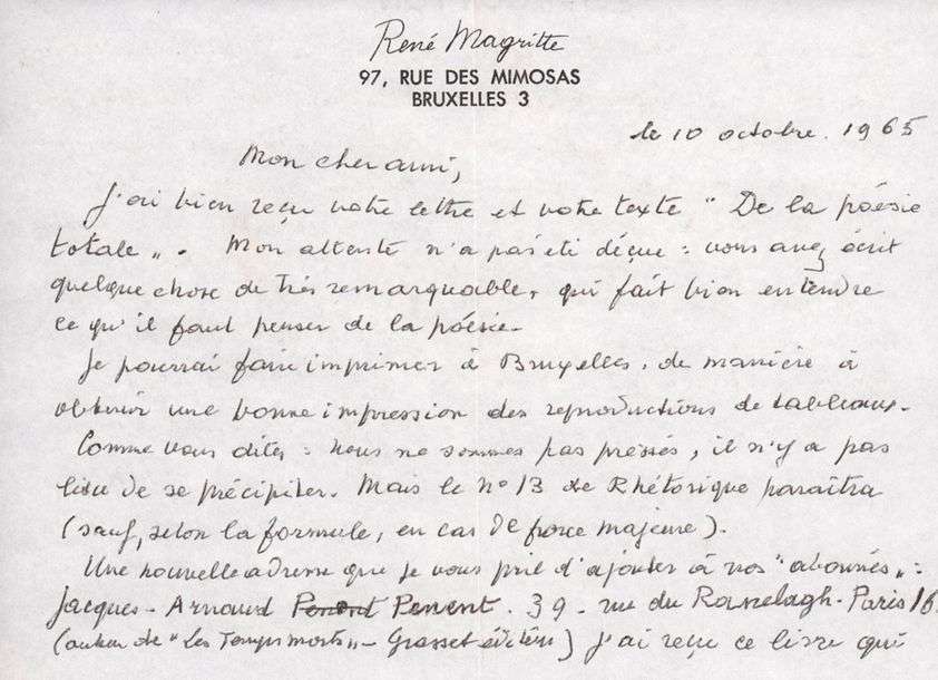 A l'occasion de la publication à venir du numéro 13 de la Revue surréaliste belge Rhéthorique, Magritte se fait critique littéraire, évoquant les ouvrages de Jacques Arnaud Penent et Raymond Queneau. Il a reçu le texte de son correspondant, «De la poésie totale»| (...) mon attente n'a pas été déçue: vous avez écrit quelque chose de très remarquable qui fait bien entendre ce qu'il faut penser de la poésie. Je pourrai faire imprimer à Bruxelles, de manière à obtenir une très bonne impression des reproductions des tableaux. Comme vous dites| nous ne sommes pas pressés, il n'y a pas lieu de se précipiter. Mais le n°13 de Rhétorique paraitra (...). Il demande d'ajouter «à nos abonnés» les noms de Jacques Arnaud Penent, auteur de Les Temps morts chez Grasset| J'ai reçu ce livre qui vaut la peine d'être lu, ce qui est rare par les temps qui courent. Par contre «Les Fleurs bleues» de Queneau sont illisibles pour moi. Scut [Scutenaire] les trouvent charmantes. Sans doute suis-je incapable d'éprouver comme lui certains plaisirs littéraires (...). Il a pourtant aimé «Un rude hivers» de Queneau, etc.