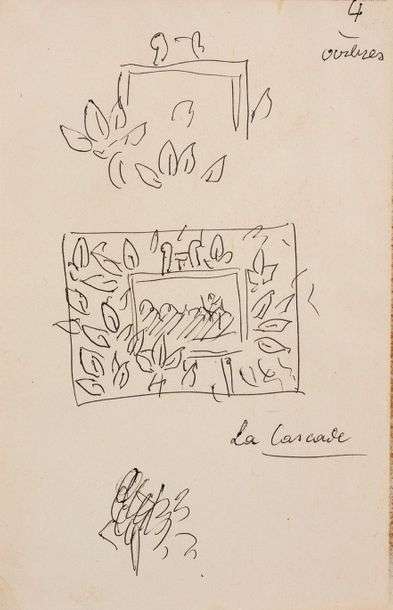 Dessin représentant divers essais de feuillage et une esquisse du tableau La Cascade, portant l'intitulé n°4 «arbre».