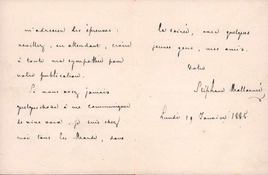 Mallarmé envoie un poème destiné à paraitre dans la Revue Wagnérienne, invitant son correspondant à se joindre aux soirées littéraires et amicales qui se tiennent tous les mardis chez lui. Voici le sonnet, qui ne vient pas très en retard, je l'espère| mille besognes m'ont empêché de répondre tout de suite à votre amicale demande. Vous aurez la bonté de m'adresser les épreuves (...). S'il a quelque chose à lui communiquer, il l'invite à venir à son salon du mardi soir.