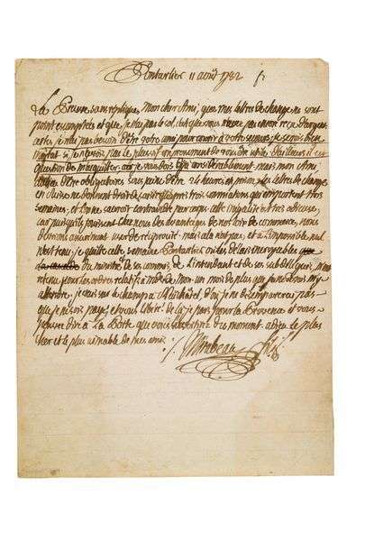 L.A.S. «Mirabeau fils», Pontarlier 11 août 1782, à M. de VITRY, commis au Bureau des finances| 1 page in-4, adresse (réparations au feuillet d'adresse).
