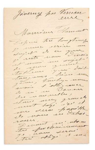 L.A.S. à M. Flament. Giverny, 10 janvier 1884. 1 p. ½ bi-feuillet in-8.