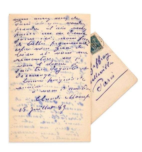 Monet se confie au critique d'art Gustave Geffroy, se montrant mécontent d'une exposition qui eut lieu à la galerie Petit| il s'était alors brouillé avec Rodin qui partageait l'exposition en s'appropriant le succès et qui aurait tenu des mots désobligeants contre Monet. Excusez-moi, je vous prie de ma vivacité, mais je crois en vérité que cette fatale exposition m'a dérangé l'esprit. Je deviens désagréable avec tout le monde, ne m'en gardez pas rancune. Tout est enfin terminé, je reçois ce matin une lettre de M. Gallimard qui répare tout. Quant aux toiles, elles me sont arrivées hier soir. Monet avait été inquiet de ne pas les recevoir| Mon inquiétude était cependant assez naturelle Gallimard m'ayant promis pour le lendemain le renvoi de mes tableaux (...) Je ne suis pas d'ordinaire si susceptible que cela mais je suis en somme si peu satisfait de mon exposition que cela me rend irritable (...) Quand vous aurez assez de Paris et que (vous) voudrez prendre l'air, venez passer un ou deux jours ici, nous ferons de belles promenades, cela vous fera du bien et vous me remonterez car je vous l'avoue, je suis très dégouté et découragé (...).