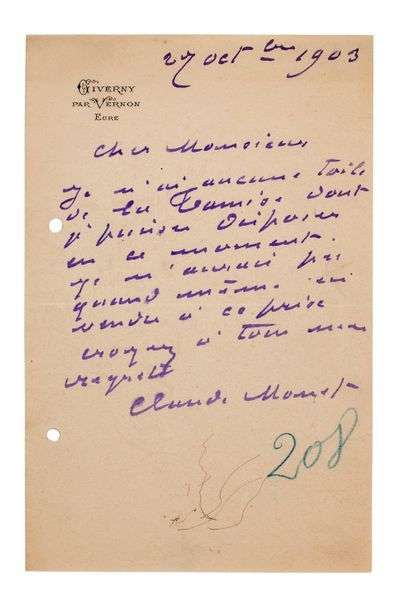 L.A.S. Giverny, 27 octobre 1903.1 p. bi-feuillet in-8, encre violette su papier en-tête de Giverny| trou de perforation.