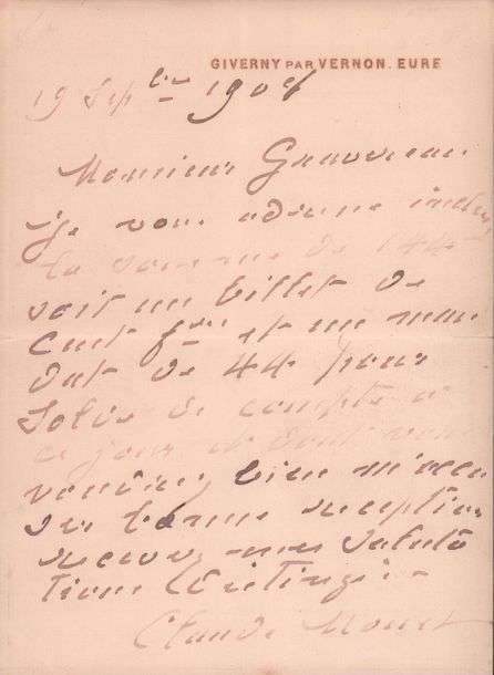 L.A.S. (à M. Ganuvieux?). Giverny, 19 septembre 1904. 1 p. in-8, en-tête en coin de Giverny par Vernon.