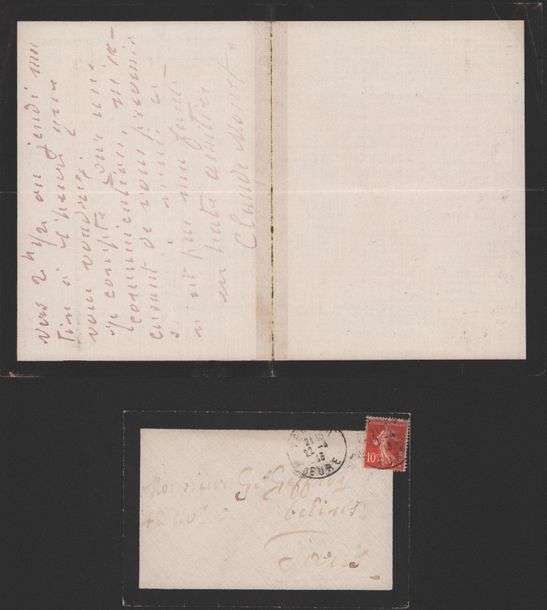 Monet prévient Geffroy, alors directeur de la manufacture des Gobelins, de son arrivée à Paris. Deux mots pour vous prévenir de ma venue à Paris et vous prier dès réception de ces lignes de téléphoner à Terminus si je pourrai vous trouver aux Gobelins. Il se propose de le voir demain ou jeudi à l'heure qu'il voudra. Je compte sur une communication, m'excusant de vous prévenir si tard, mais ce n'est pas ma faute (...).