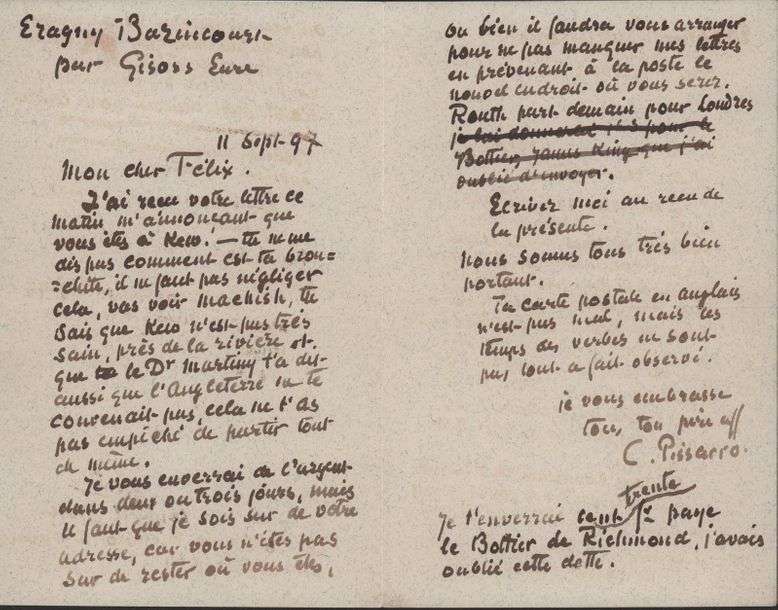 L.A.S. à son fils Félix. Eragny-Bazincourt par Gisors, 11 septembre 1897. 2 pp. bi-feuillet in-8.