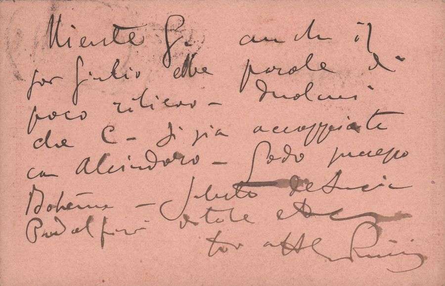 Note à son ami Clausetti, au moment où les représentations de son opéra La Bohème remporte un solide succès, où il est question des paroles de Giulio qui sont sans importance mais souhaitant régler le problème entre C[olline] et Alcindoro, deux personnages de son opéra.