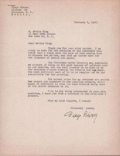 Relatif à un projet de travail avec un éditeur. Le peintre se dit prêt à attendre la décision de l'éditeur dans la mesure où sa correspondante viendrait à Mexico discuter du sujet. Il ajoute que les cartes de Noël l'intéressent, notamment pour la perspective de se retrouver pour un projet commun avec les peintres que Nettie Ling a mentionnés. Il reste le problème du coût de ses dessins qui obère pour l'instant la validation de ce projet. Joint 3 copies de la correspondance adressée par Nettie King au peintre, en 1947| on y trouve notamment le nom des artistes salués par Rivera (Norman Rockwell et Picasso) et l'aboutissement du projet de cartes de Noël (3 pp. au carbone).