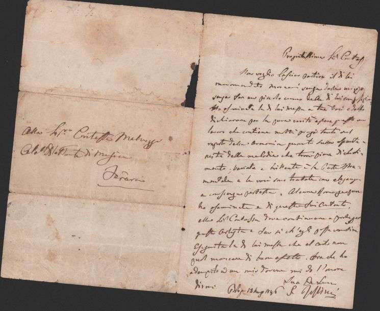 Lettre de Rossini dans laquelle il fait l'éloge des compositions d'un musicien dénommé Mornari, qui avait été recommandé par la comtesse. Il apprécie «la mélodie et la patte instrumentale» de sa messe à trois voix.