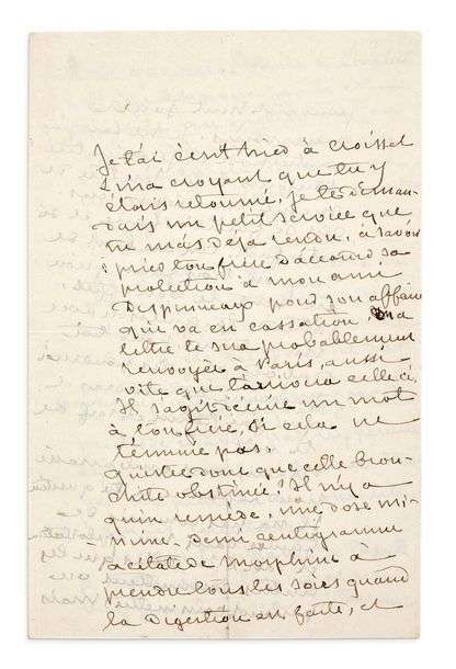 Lettre de Sand évoquant ses liens intimes avec Flaubert. Elle demande tout d'abord, de faire intervenir le frère de Flaubert pour une affaire qui est renvoyé en cassation. Je t'ai écrit hier à Croisset (...). Puis elle s'inquiète de la santé de Flaubert, lui recommandant un remède à base de morphine. Qu'est-ce que cette bronchite obstinée? Il n'y a qu'un remède (...). Je ne fais pas autre chose et je m'en tire toujours bien (...).