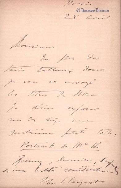 Relative à la préparation d'une exposition à venir. En plus des trois tableaux dont je vous ai envoyé les titres (...), je désire exposer (...) une quatrième petite toile: Portrait de Me W* (...).