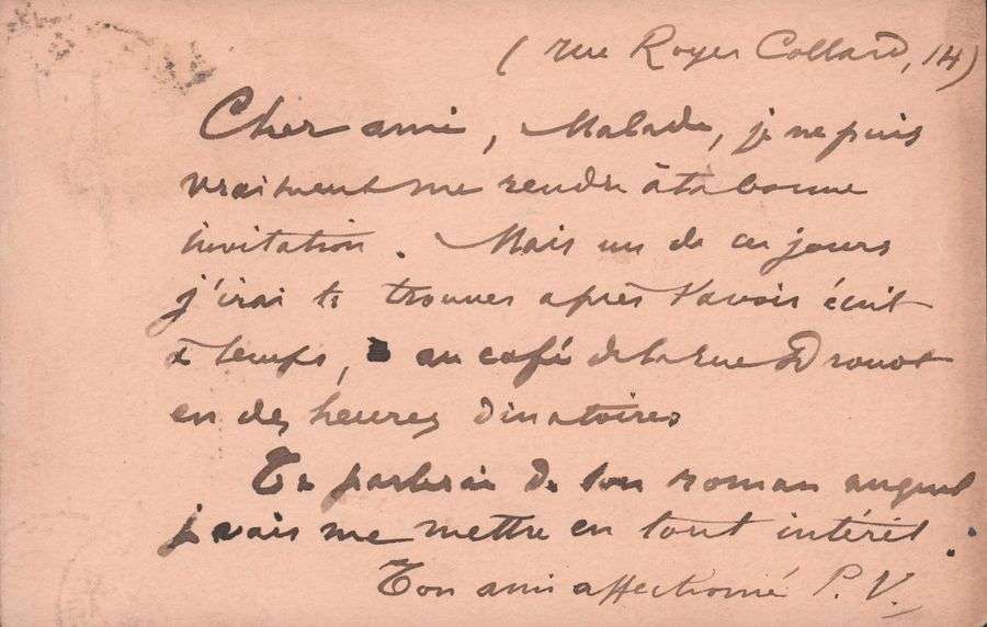 Déclinant une invitation à déjeuner. Cher ami, malade, je ne puis vraiment me rendre à ta bonne invitation. Mais un de ces jours j'irai te trouver après t'avoir écrit à temps au café de la rue Drouot en des heures dinatoires. Te parlerai de ton roman [Les Deux frères] auquel je vais me mettre en tout intérêt (...).
